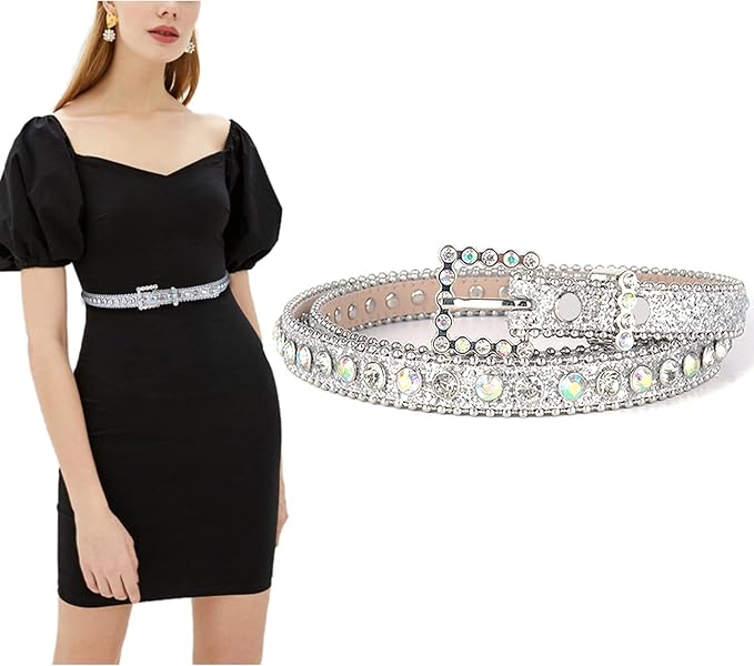 Womens Thin Belts Skinny Leather Belt Luxury Strap Rhinestones Studded Bling Waist Belt
